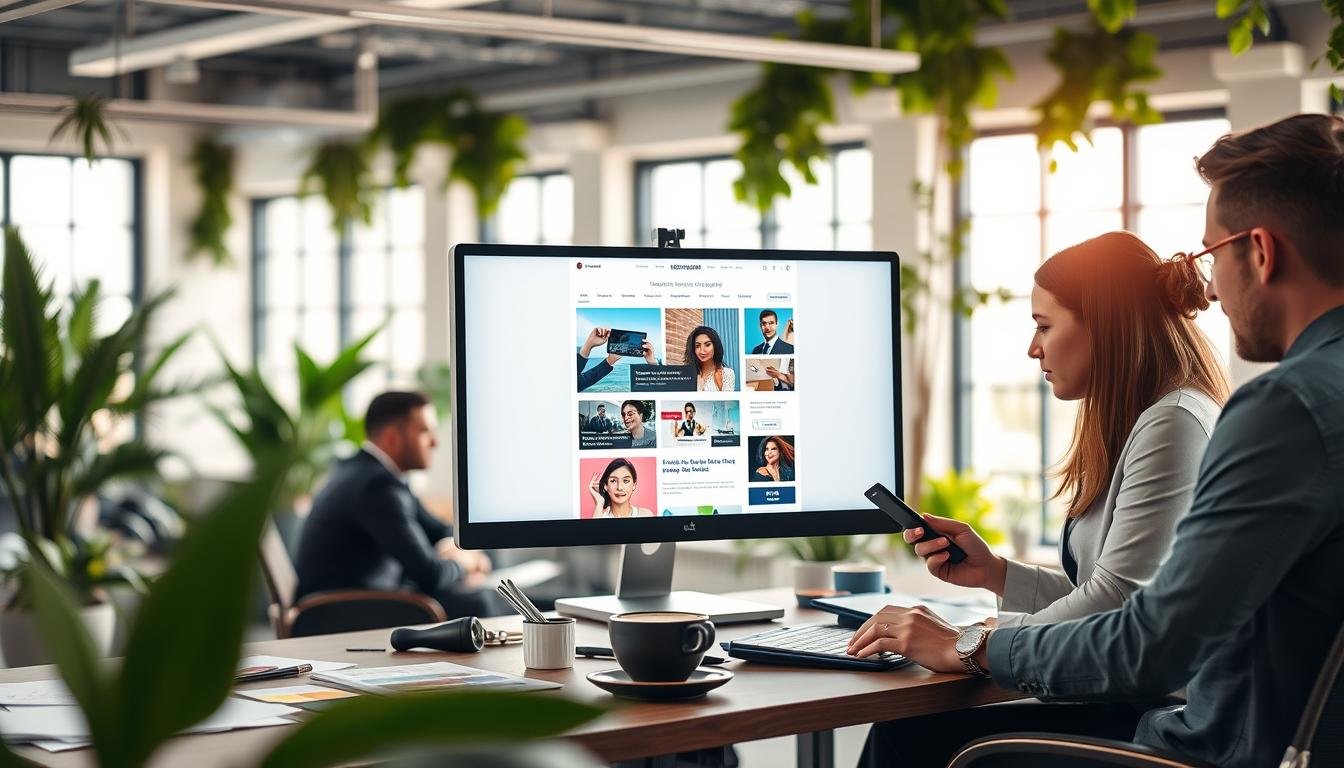 A sleek, modern workspace featuring an elegant laptop displaying a vibrant video playback interface on the screen. In the foreground, a creative professional with business attire is intently focused on editing video content. The middle ground showcases various marketing tools like a logo design on a tablet and social media graphics scattered on a stylish desk. The background is softly blurred, revealing a contemporary office environment with bright, natural lighting streaming in through large windows, enhancing the energetic atmosphere. The scene captures a sense of creativity, professionalism, and dynamic productivity, embodying the essence of integrated marketing tools.