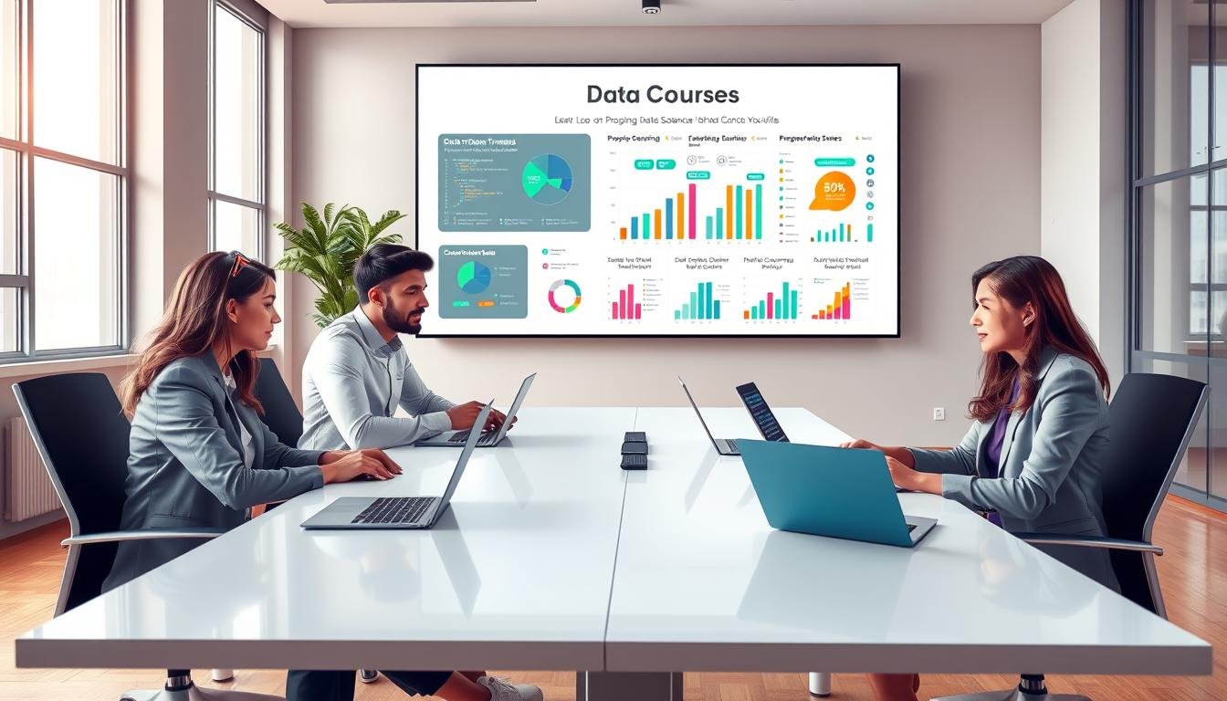 A modern office setting showcasing data science and analytics. In the foreground, a diverse group of three professionals, a woman and two men, dressed in business attire, focus intently on a laptop displaying complex data visualizations and graphs. The middle layer features a large digital screen on the wall highlighting key metrics and analytical trends. Surrounding them are charts, graphs, and colorful diagrams that illustrate data science concepts, with a whiteboard adorned with handwritten notes and formulas. The background includes large windows letting in natural light, creating an airy and productive atmosphere. Soft lighting emphasizes the screen's glow, casting a warm ambiance. The scene conveys a sense of collaboration, innovation, and learning in the field of data science analytics.