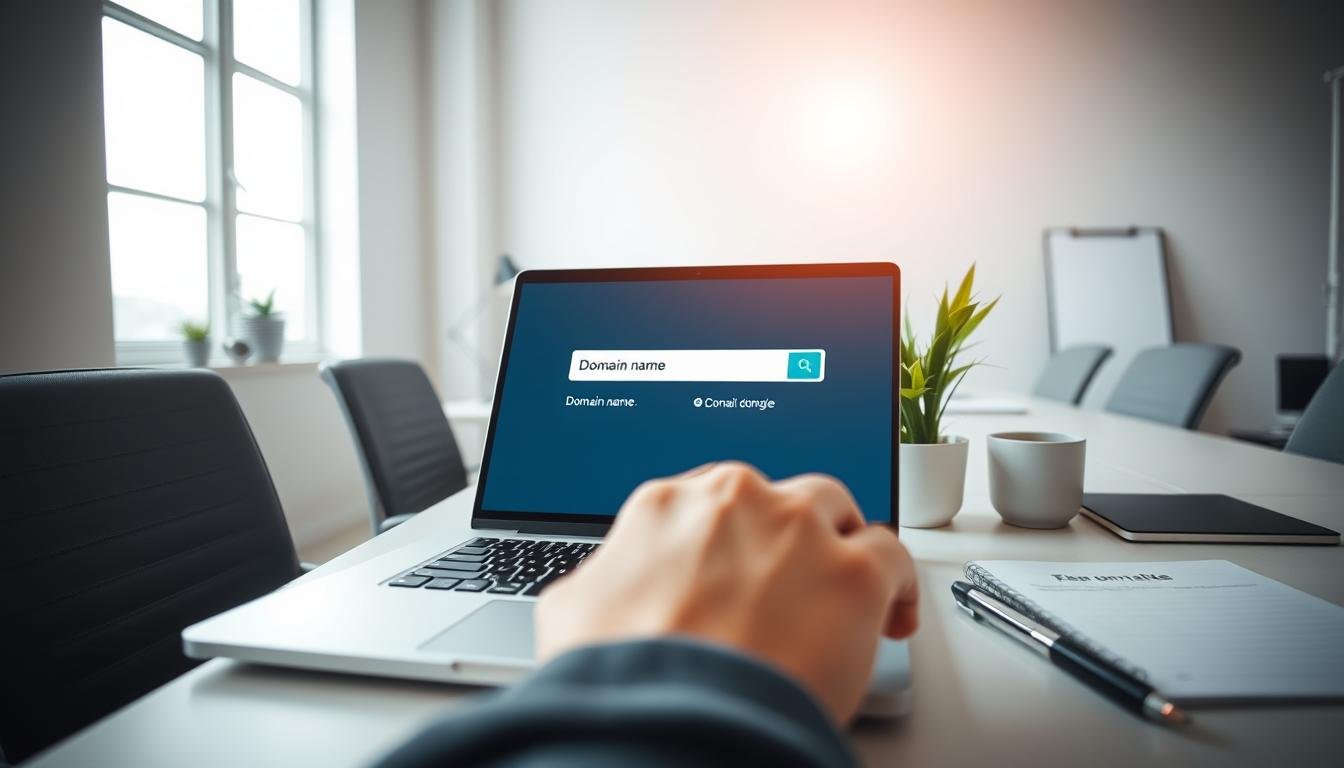 A modern office workspace featuring a sleek laptop displaying the Namecheap website interface, prominently showcasing a domain registration process. In the foreground, an elegant desktop setup with a stylish desk, a potted plant, and a cup of coffee creates a professional atmosphere. In the middle ground, the laptop screen is illuminated with vibrant colors, highlighting the user-friendly interface of Namecheap. The background shows a softly blurred cityscape through a window, bathed in natural light that adds warmth to the scene. The overall mood is focused and productive, capturing the experience of registering and managing a domain seamlessly.